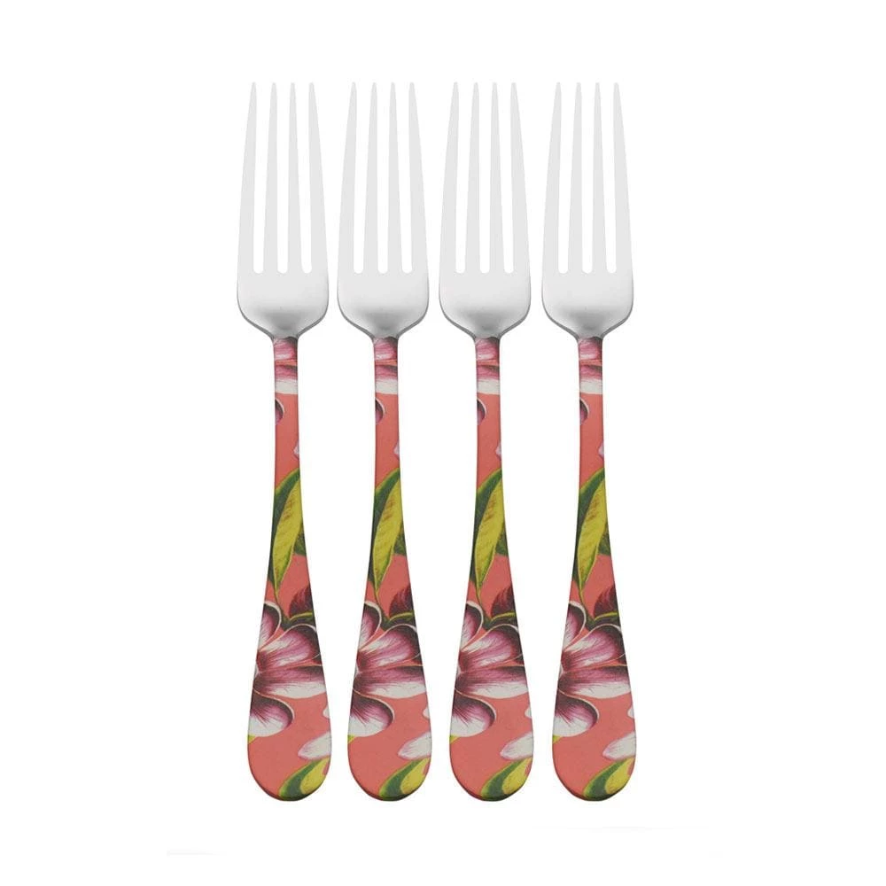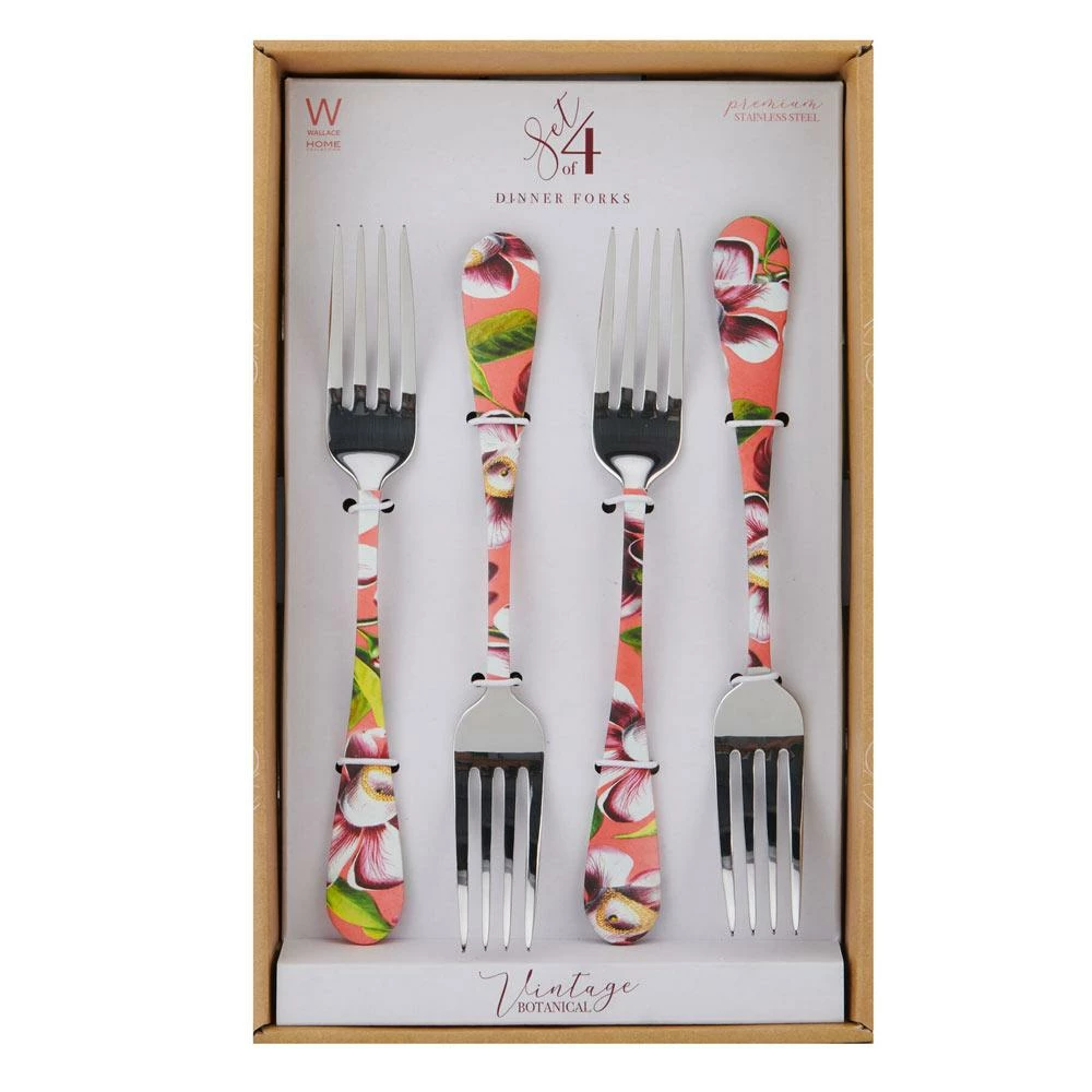 This Wallace Vintage Botanical Set of 4 Dinner Forks outstanding pink and printed floral artwork on stainless steel, and it will add a lovely, decorative touch to your table setting.